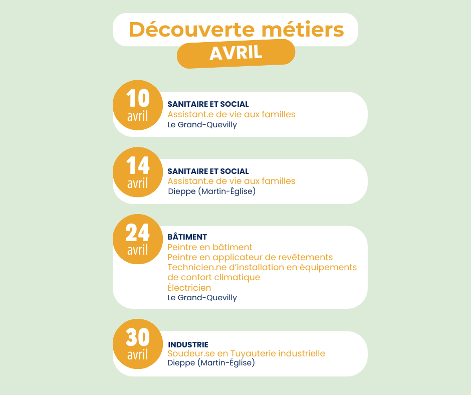 En avril, partez à la découverte des métiers du sanitaire et social, du bâtiment travaux publics et de l’industrie.