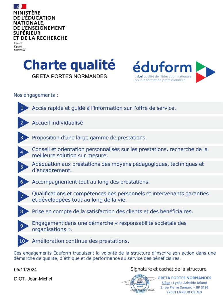 Le GRETA Portes normandes est labellisé Eduform et certifié Qualiopi pour les actions de formation, les bilans de compétences et les actions permettant la validation des acquis de l’expérience.